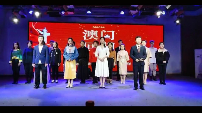 演出以热情洋溢的舞蹈开场,富有节奏感的音乐、神形兼备的舞姿、绚烂多变的灯光瞬间点燃现场观众的热情。随后,由20名同学组成的合唱队,高唱《七子之歌》,热烈庆祝澳门回归祖国20周年。悠扬的歌声,让现场的观众感受到了播音学子们对伟大祖国的热爱之情。