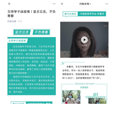 4月28日起,最美疫情防控志愿者事迹分享活动拉开帷幕,活动通过线上采访志愿者的战“疫”事迹和切身体会,依托“行知文传”公众号发布,展现广大青年团员积极参与疫情防控的青春形象,充分发挥青年典型的示范引领作用。