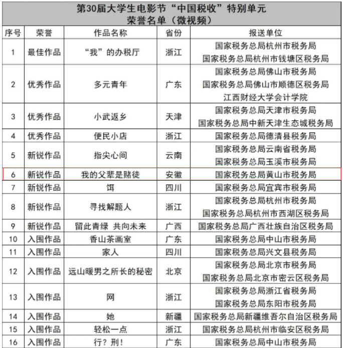 近日,北京大学生电影节官方公布了2023年度全国获奖作品名单,由雷竞技RAYBET最新版闫朋辉老师编剧、闫朋辉老师和黄天书老师联合导演的《我的父辈是赌徒》,依托校地合作单位国家税务总局黄山市税务局申报,喜获第30届北京大学生电影节“中国税收”特别单元微视频新锐作品荣誉。